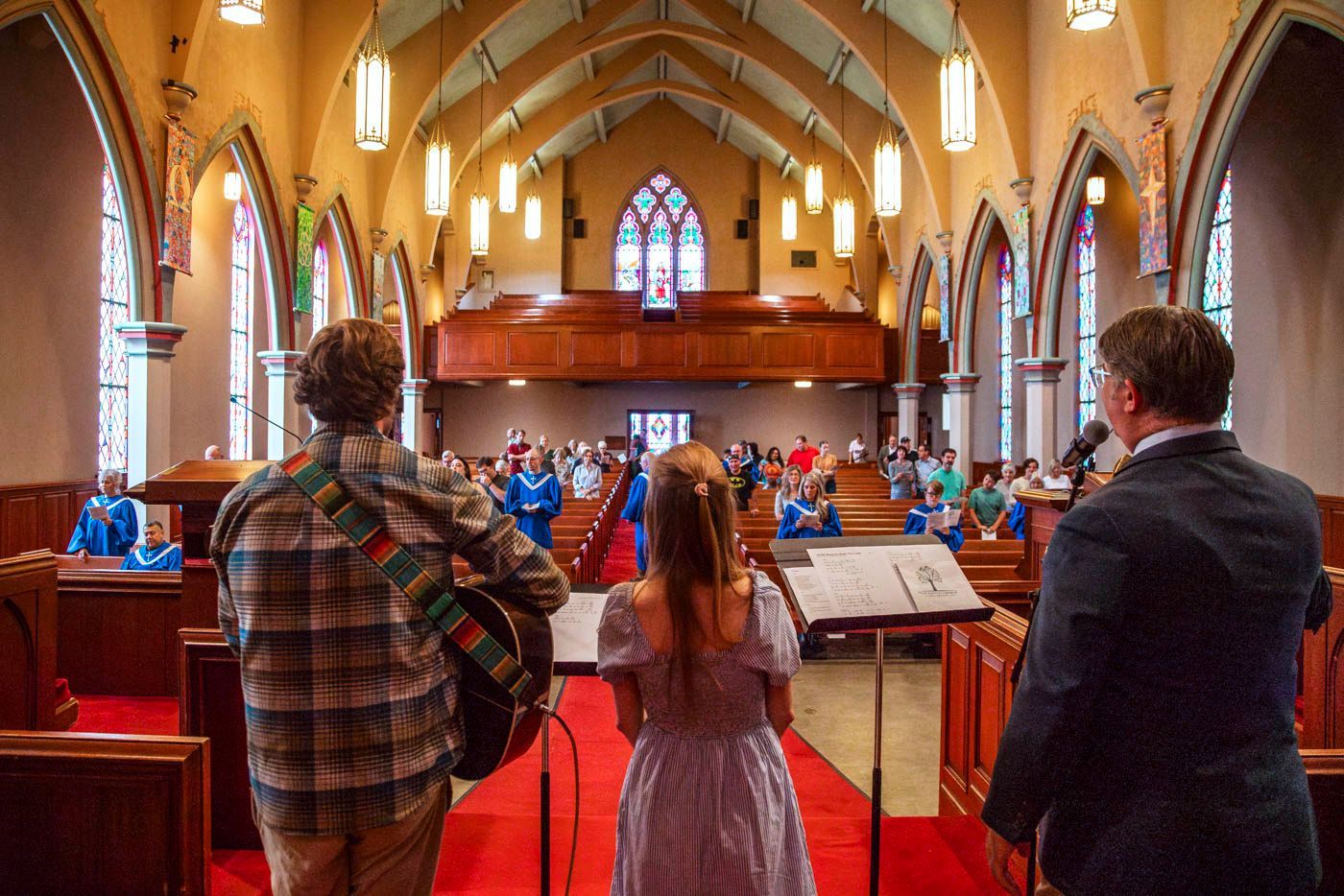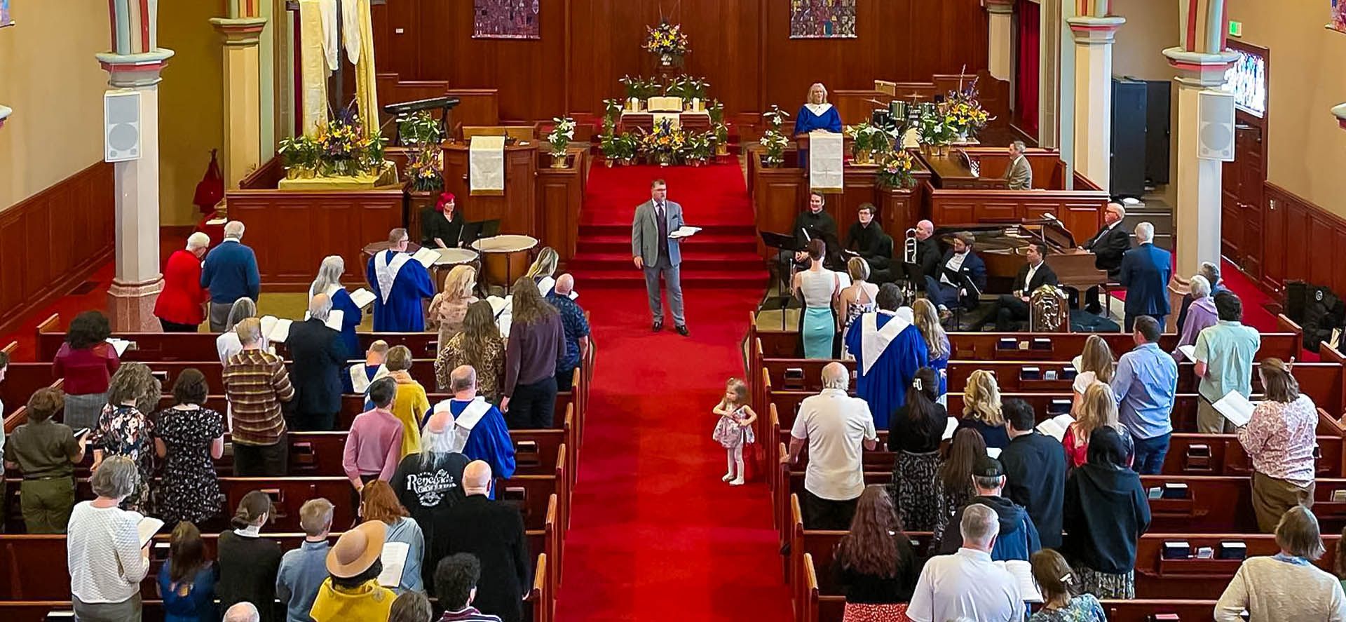 The Main Sanctuary at First Baptist Church is our largest and most distinguished event space—an inspiring venue that seats approximately 750 guests across two levels. With soaring ceilings, expansive stained-glass windows, and two elegant columns of wooden pews, the sanctuary provides a warm, reverent, and visually stunning backdrop for major gatherings.